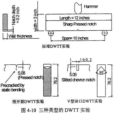 實驗證實,對有上臺能的控軋鋼進(jìn)行的實驗中,標(biāo)準(zhǔn)DWTT實驗比夏比沖擊實驗在評價延性裂紋擴展行為上有更好的對應(yīng)關(guān)系。但對于高韌性的淬火回火鋼,標(biāo)準(zhǔn)DWTT試樣由于在起裂過程中吸收了大量的功,致使裂紋擴展的應(yīng)變速度過低而與真實擴展?fàn)顩r不符。采用靜態(tài)預(yù)制裂紋DWTT試樣或雙試樣DWTT法是解決這一問題的兩種方案,如圖4-10所示。