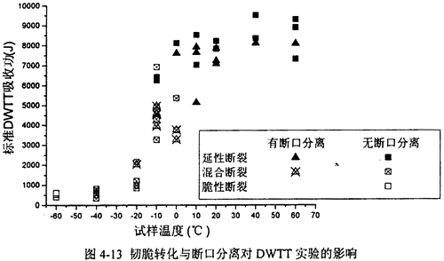 圖4-13比較了在延性和脆性斷裂中有無斷口分離試樣的DWTT韌性值。結(jié)論與CVN實驗類似,發(fā)生斷口分離的試樣,測得韌性值略低。