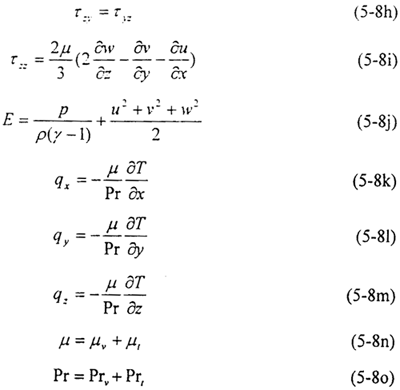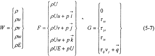 式中P為密度,U=u+v+w表示速度,E為總能,,,分別為沿x,y,z方向的單位矢量。為粘性應(yīng)力項(xiàng),是熱通量。