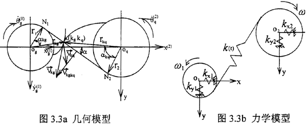在以往對(duì)外齒輪模型簡(jiǎn)化時(shí)主要采用兩種方法如圖3.3a、3.3b幾何模型和力學(xué)模型。在幾何耦合模型中,齒輪輪齒被視為剛體。假定:1.嚙合過程中輪齒始終保持接觸,不脫嚙。2.嚙合線方向保持不變。要滿足假設(shè)1,按兩齒輪接觸表面法向速度相等原則: