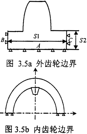 對(duì)于外齒輪Daimler-Benz公司選取邊界的方法是先取半個(gè)齒輪進(jìn)行有限無計(jì)算,這是從整體來考慮問題,然后根據(jù)計(jì)算的結(jié)果來選擇邊界的范圍,其所定的邊界寬度如圖3.5a,S1=6.1m,m是齒輪的模數(shù)。Chaber所取的邊界的方法是考慮圣維需原理,其所定的邊界深度為S2=1.5m。綜合以上兩者的研究,用有限無計(jì)算外齒的變形,計(jì)算模型的邊界范圍可取: