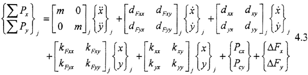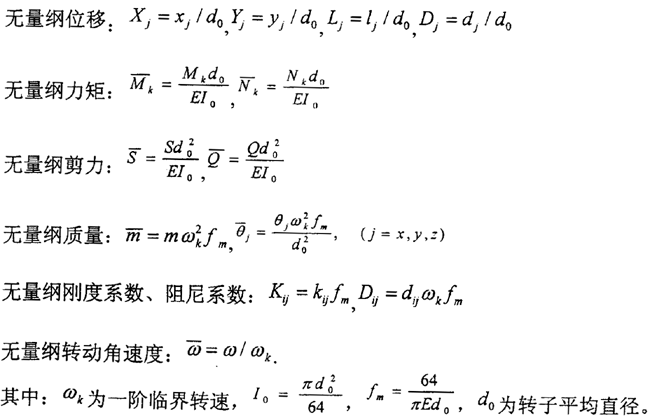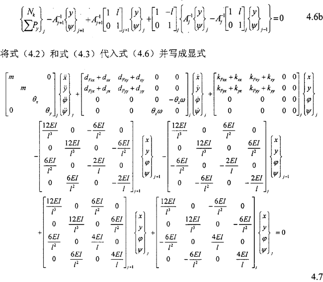 式4.3中右端第一項為慣性力:三、五兩項為滑動軸承的油膜力;二、四兩項為外加阻尼力及剛度力……,Pcx,Pcy則代表與系統(tǒng)本征值無關的外加激勵力、不平衡力、重力或其它控制力。ΔFx,ΔFy為齒輪動態(tài)嚙合力在x、y方向上的分量。當所簡化的質(zhì)點是各向同性時,其直徑轉(zhuǎn)動慣量θx=θy=Jd,極轉(zhuǎn)動慣量θz=Jp。