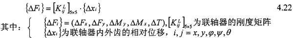 因此通過聯軸器的剛度[KijL]5×5(由第三章求得)把動態(tài)力和力矩表示成內外齒相對位移的顯函數,從而得到齒輪聯軸器連接軸系的彎曲和扭轉振動方程。