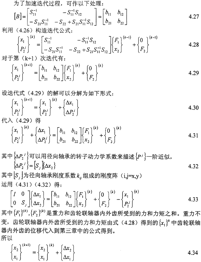 在方程(4.25)中{F1},{F2}為對應于{x1},{x2}的廣義力向量,其中也包括了齒輪聯軸器內外齒所受到的力和力矩。{Pj}則僅由徑向軸承提供的油膜反力組成。當{F1},{F2}和{x2}已知時,可解得{x1},{Pj}。