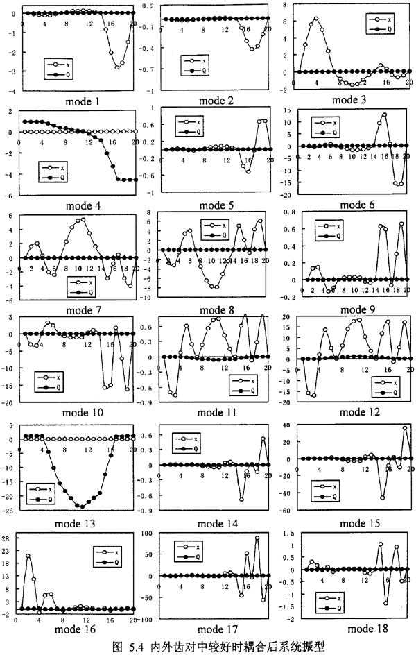 但是,另外我們可以發(fā)現(xiàn),在表5.3中出現(xiàn)了許多表5.1和表5.2中所沒有的新的固有頻率如λ4co,λ7co,λ8co,λ11co,λ12co,λ13co,觀察這些因有頻率所對應的振型,可以發(fā)現(xiàn),它們對應又可分為三種,1.純的彎曲耦合振型λ7co,λ8co對應振型圖5.4中mode7、8;2.純的扭轉(zhuǎn)耦合振型λ4co,λ13co對應振型圖5.4中mode4、13;3.彎扭振型相迭加的復振型——彎扭耦合振型λ11co,λ12co對應振型圖5.4中mode11、12。這種彎耦合振型是由于齒輪聯(lián)軸器的耦合作用而新產(chǎn)生的,這是齒輪軸系統(tǒng)區(qū)別于一般單轉(zhuǎn)子系統(tǒng)的重要特征之一,由于彎扭耦合模態(tài)的產(chǎn)生,決定了軸系統(tǒng)的振動是彎扭耦合振動。