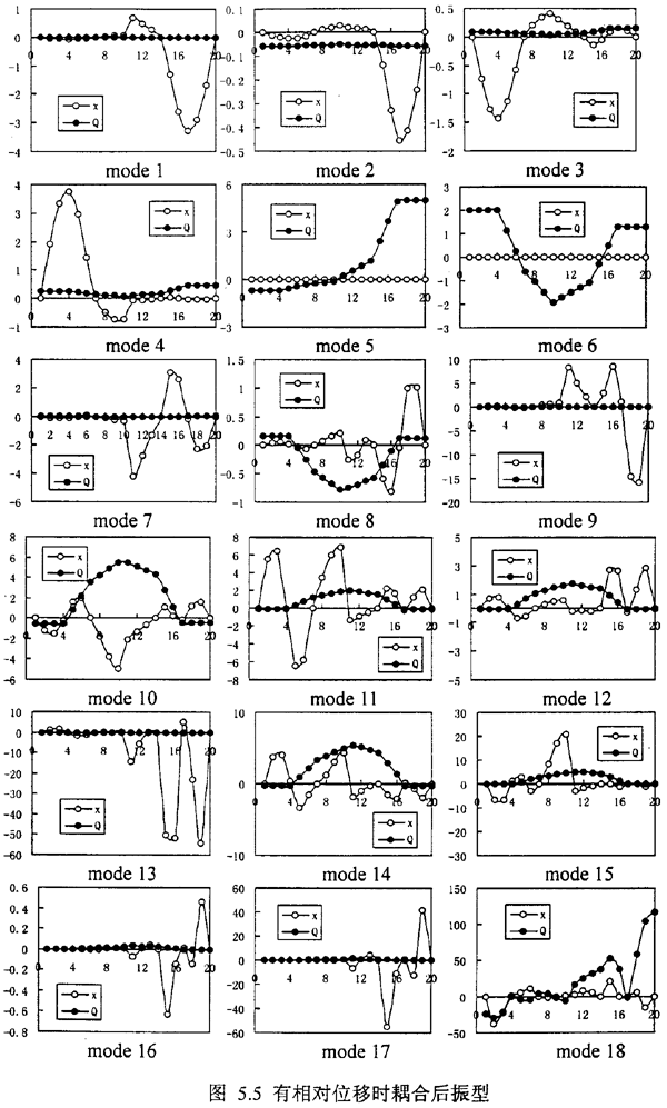 表5.3是耦合系統(tǒng)在同樣的轉(zhuǎn)速下,前18階的固有頻率,圖5.4是這些固有頻率對應的耦合狀態(tài)下轉(zhuǎn)子的振型;橫坐標質(zhì)點1~10代表軸1、11~20代表軸2;縱坐標為振型;實點表示扭轉(zhuǎn)振型、空心點表示彎曲振型。