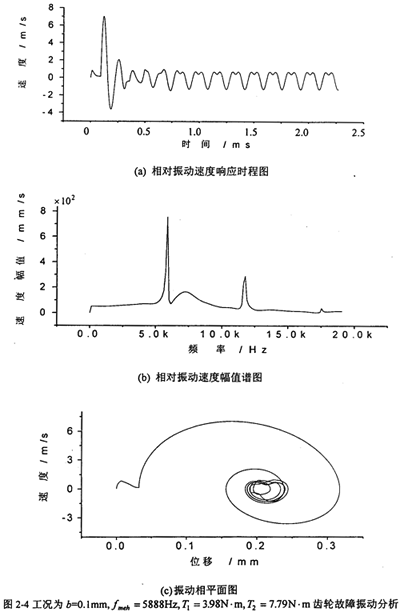 圖2-4是工況為:齒輪嚙合頻率為5888Hz、但齒側(cè)間隙b=0.1mm=Sn。(齒厚)齒輪故障振動(dòng)分析,其中(a)圖為齒輪輪齒相對(duì)振動(dòng)速度時(shí)程響應(yīng)圖,(b)圖為齒輪輪齒相對(duì)振動(dòng)速度幅值譜圖。從圖上可看出,當(dāng)齒側(cè)間隙增加到O.lmm時(shí),此時(shí)振動(dòng)故障頻率仍為齒輪嚙合頻率fmeh的1、2、3倍。相平面圖也穩(wěn)定于一個(gè)封閉曲線(見(jiàn)(c)圖)。