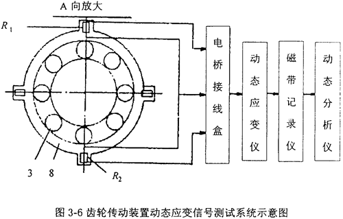 圖3-5是被測試的齒輪傳動裝置傳動系統(tǒng)簡圖,圖3-6是測試該齒輪傳動裝置箱體動態(tài)激勵力應(yīng)變信號的系統(tǒng)示意圖。零件8為裝在軸承外圈上的套圈。套圈把軸系施加給軸承的載荷分成水平方向和垂直方向再傳給箱體。如圖3-6所示,在套圈的水平和垂直方向分別貼上兩片電阻應(yīng)變片,并分別組成各自的全電橋電路。當軸系產(chǎn)生振動時,軸承對箱體的作用力也隨之發(fā)生變化,也使貼在套圈上的應(yīng)變片的電阻值產(chǎn)生變化,而電阻的變化則通過動態(tài)電阻應(yīng)變儀輸出電壓信號,并經(jīng)磁帶記錄儀將此電壓信號記錄下來。若將所得的信號在動態(tài)數(shù)字分析儀上進行時域和頻域分析,再經(jīng)過比較,就可對齒輪傳動裝置內(nèi)的軸系部件的故障作出較為正確的診斷。