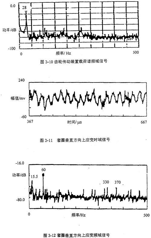 圖3-9和圖3-10分別是稱重傳感器測(cè)出的由磨擦加載裝置施加給齒輪傳動(dòng)裝置載荷時(shí)域和頻域信號(hào)(功率譜)。從圖3-9和圖3-10可看出,載荷主要分量是頻率為28Hz正弦波。圖3-11和圖3-12分別是套圈垂直方向上應(yīng)變時(shí)域和頻域信號(hào)(功率譜)。