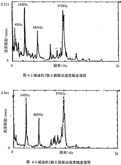 圖4-3、4-4分別是把振動加速度計放在減速機I軸A側(cè)和B側(cè)軸承座上所測得振動速度幅值譜圖;圖4-5、4-6分別是把振動加速度計放在減速機II軸A側(cè)和III軸B側(cè)軸承座上所測得振動速度幅值譜圖;圖4-7、4-8分別是把振動加速度計放在減速機IV軸A側(cè)和B側(cè)軸承座上所測得振動速度幅值譜圖。