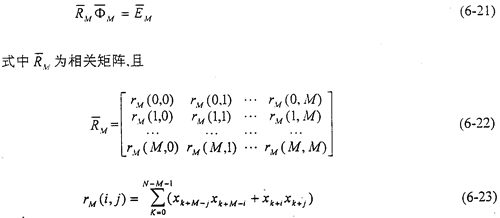 相關(guān)矩陣(6-22)式表示為Toeplity矩陣和Hankel矩陣相乘,使求解AR(M)模型參數(shù)