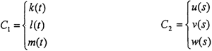 假設(shè)M點(diǎn)是兩軸的嚙合點(diǎn)(運(yùn)動(dòng)曲線C1和C2的交點(diǎn),也就是傳力點(diǎn))假設(shè)初始條件為:當(dāng)時(shí)間t=0時(shí),i(輸入軸轉(zhuǎn)角),0(輸出軸轉(zhuǎn)角)均為零,在兩坐標(biāo)系OXiYiZi和OXjYjZj中,曲線Cl和C2的方程分別為: