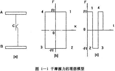 雙線性模型是非線性遲滯系統(tǒng)模型中最簡(jiǎn)單的一種,而且也是最為久遠(yuǎn)的模型,對(duì)于它的初始機(jī)理研究最早可追溯到三十年代的Deo Hartog,他在研究干摩擦?xí)r提出了干磨擦的理想模型,他認(rèn)為在一個(gè)具有干摩擦面的單自由度系統(tǒng)中,干摩擦力隨相對(duì)滑移位移的關(guān)系可用一矩形來(lái)表示,如圖1-1所示。當(dāng)該系統(tǒng)受到外力激勵(lì)發(fā)生運(yùn)動(dòng)時(shí),干摩擦力總是與運(yùn)動(dòng)速度反向而且阻礙運(yùn)動(dòng),進(jìn)而耗損系統(tǒng)的能量,從時(shí)域的角度看,干摩擦力的波形為矩形波,Den Hartog還按能量耗散相等原理,把理想干摩擦等效成粘性阻尼。實(shí)際上干摩擦交界面,在外力小于摩擦力時(shí),兩邊就有變形,隨著外力的增加,此變形隨之增大,這是因?yàn)榻唤缑鎯蛇叺奈镔|(zhì)有一定的彈性。即使兩邊有較大的滑移時(shí),交界面上的干摩擦力仍然不是常數(shù),而是隨振幅的增大而緩慢上升的。Earlestes等人對(duì)此作了描述,認(rèn)為一旦交界面有了滑移,干摩擦的線性力不是常數(shù)(4Ffπ),而是與相對(duì)位移X有關(guān),從Ff變到4Ff/π,表達(dá)式為