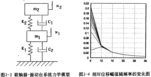 對應(yīng)的力學(xué)模型如圖2-3(見22頁)所示,式中m1為振動臺動圈、聯(lián)軸器外套及固定在振動臺上夾具的質(zhì)量;m2為聯(lián)軸器內(nèi)套、芯軸及配重的質(zhì)量;K1為振動臺支撐動圈部分的剛度系數(shù),K2為聯(lián)軸器彈性元件的剛度系數(shù);C1為振動臺動圈阻尼系數(shù);C2為聯(lián)軸器
