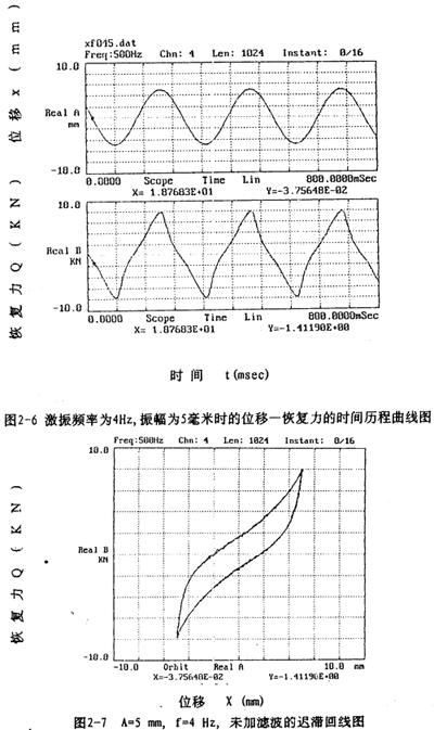 信號處理時,將磁帶記錄儀記錄的五路振動信號經(jīng)磁帶記錄儀回放,輸出到數(shù)據(jù)采集板(A/D板)進(jìn)行五路振動信號(恢復(fù)力、位移、速度、加速度信號)同步采樣和A/D轉(zhuǎn)換,然后輸出到PC386微機存人磁盤,該數(shù)據(jù)采集系統(tǒng)采集的數(shù)據(jù)都是以二進(jìn)制形式存儲的文件。為了計算和閱讀方便,需將二進(jìn)制數(shù)據(jù)文件轉(zhuǎn)換成ASC碼文件,然后再編程進(jìn)行數(shù)據(jù)處理.對處理后形成的數(shù)據(jù)文件進(jìn)行作圖可以形成許多相應(yīng)的曲線圖,圖2-6至圖2-13是眾多曲線中的一部分。