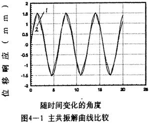 =2時(shí)兩者的重合性很好。(2).隨著振幅的增大,解析解曲線1和仿真解曲線2在相位上產(chǎn)生微小變化,解析解的相位超前仿真一個(gè)小量,原因是隨著振幅的增大,系統(tǒng)呈現(xiàn)更為強(qiáng)烈的非線性,而在推導(dǎo)中略去了高次項(xiàng),但還是可以滿足工程的要求。(3)從(4-78)-(4-85)式中的各δ值可知,在聯(lián)軸器產(chǎn)生主共振的情況下,激振力很小。