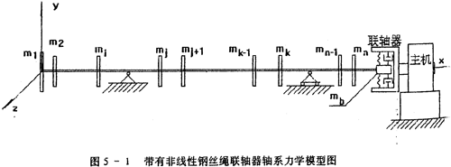 在第三章,根據(jù)試驗(yàn)的基礎(chǔ)建立了具有非線性遲滯特性聯(lián)軸器的恢復(fù)力模型。這一章,將研究一個(gè)帶有這種聯(lián)軸器的軸系如圖5-1所示,該軸系有n個(gè)圓盤,由鋼絲繩聯(lián)軸器與主機(jī)相連接,按以下原則建立力學(xué)模型: