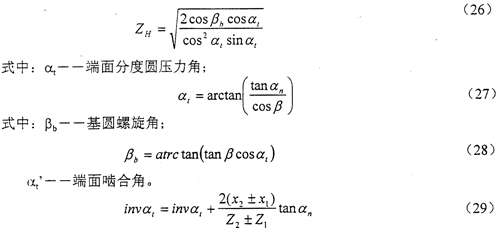 節(jié)點(diǎn)區(qū)域系數(shù)ZH是考慮節(jié)點(diǎn)處齒廓曲率對(duì)接觸應(yīng)力的影響,并將分度圓上切向力折算為節(jié)圓上法向力的系數(shù)。ZH數(shù)值可由式(26)計(jì)算得出。