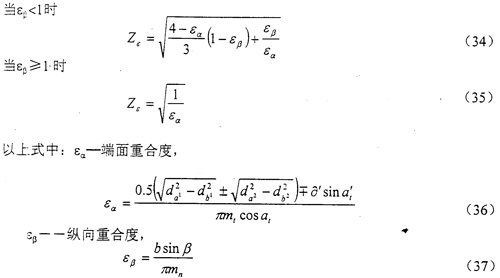 重合度系數(shù)Zε是用以考慮重合度對(duì)單位齒寬載荷的影響。Zε可由式(33)、(34)、(35)計(jì)算得出。