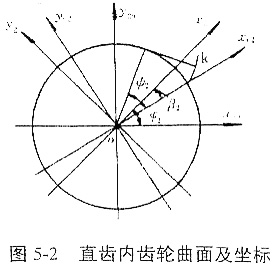 內(nèi)齒輪輪齒為直齒,其端面齒形及坐標關(guān)系如圖5-2所示。設(shè)端面齒廓線為漸開線,xc2坐標通過漸開線在基圓上的起點,在(o,xc2,yc2,zc2)坐標下的齒面方程為