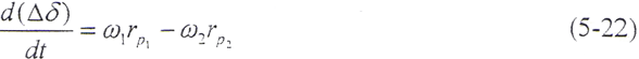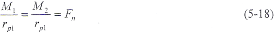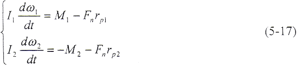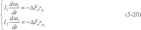 如果在t=0的瞬時,由于干擾載荷的作用,輪齒的變形量增大△δ,則齒上的載荷也獎增加△Fn,當轉(zhuǎn)矩M1、M2為定值時,由齒輪的平衡條件可知,齒輪的角速度ω將發(fā)生周期性變化,而載荷和變形也以同一頻率變化。由(5-17)式和(5-18)式,得