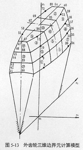 對(duì)共軛鼓形齒輪用邊界元法進(jìn)行接觸問(wèn)題的研究與分析時(shí),首先只需對(duì)邊界即齒廓表面進(jìn)行單元?jiǎng)澐,然后?duì)每個(gè)嚙合點(diǎn)即接觸區(qū)進(jìn)行局部細(xì)分,不需像有限元法那樣,需從表到里將整個(gè)齒輪輪齒進(jìn)行劃分。