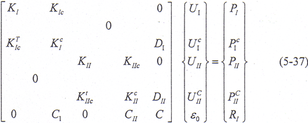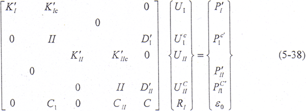 若用三角分解算法進(jìn)行分解消元運(yùn)算,使與接觸面有關(guān)的剛度矩陣變換成為單位矩陣,同時(shí)求出相應(yīng)的系數(shù)矩陣的改變DⅠ、DⅡ和載荷向量的改變PⅠ′、PⅠC、PⅡ′、PⅡC,則矩陣方程成為