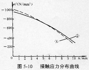 基于上述接觸問(wèn)題的有限元與邊界元計(jì)算模型和前面的載荷分析,對(duì)一模數(shù)m=5mm、齒數(shù)Z=40、分度圓壓力角a=20°、分度圓直徑d=200mm、齒寬b=20mm、齒輪材料的彈性常數(shù)E=2.1×105N/mm2、泊松比μ=0.3、傳遞扭矩Mn=300N·m的共軛鼓形齒聯(lián)軸器鼓形齒輪Ⅰ進(jìn)行了接觸應(yīng)力計(jì)算,其簡(jiǎn)圖如圖5-9所示。該問(wèn)題接觸應(yīng)力的有限元與邊界元數(shù)值解和接觸應(yīng)力分布曲線(xiàn)分別如表5-1、圖5-10所示。曲線(xiàn)①(虛線(xiàn))為接觸應(yīng)力的有限元解;曲線(xiàn)②(實(shí)線(xiàn))為接觸應(yīng)力的邊界元解。