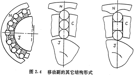 圖2.4所示是推桿與導(dǎo)槽所構(gòu)成的移動(dòng)副的另外幾種形式,它們也未能很好地解決移動(dòng)副所帶來(lái)的滑動(dòng)摩擦問(wèn)題。