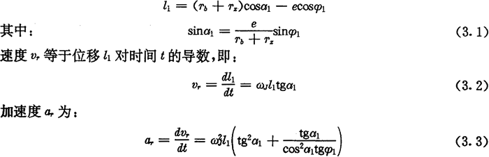 推桿在工作行程開(kāi)始時(shí),l1值為最小,這時(shí)lmin=Tb+Tz-e,α1=0,φ1=0,vr=0,