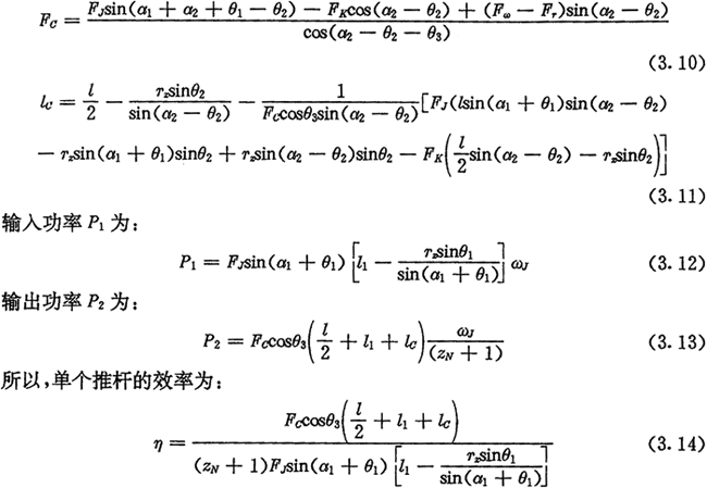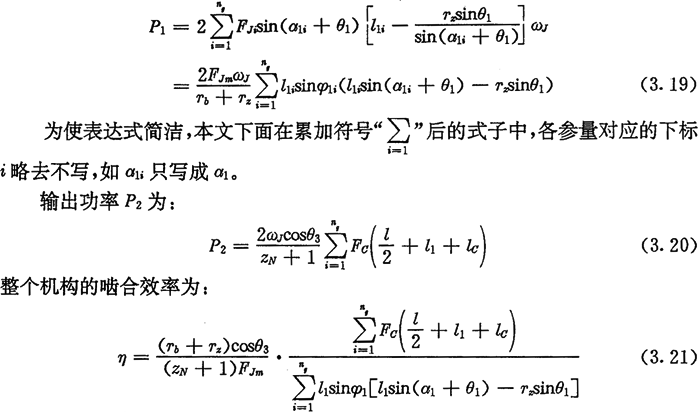 計(jì)算時(shí),先根據(jù)輸入功率P1及轉(zhuǎn)速ωJ由(3.19)式計(jì)算出FJm,然后對(duì)每一工作推桿由式(3.17)計(jì)算出FJi,由式(3.10)式及式(3.11)計(jì)算出Fci及l(fā)ci,最后代入式(3.21)計(jì)算出效率η。