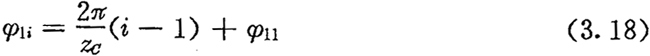 由于相鄰兩推桿所夾的中心角為2π/ZC,在某一時(shí)刻,只要其中一個(gè)工作推桿所對(duì)應(yīng)的激波器位置角(激波器相對(duì)該推桿從初始工作位置轉(zhuǎn)過(guò)的角度φ1)確定后,其它各工作推桿所對(duì)應(yīng)的激波器位置角也隨之確定下來(lái)。設(shè)各工作推桿所對(duì)應(yīng)的最小激波器位置角為φ11,如圖3.6所示,則從對(duì)應(yīng)激波器位置角為φ11的這個(gè)工作推桿開(kāi)始,順序第i個(gè)工作椎桿所應(yīng)的激波器位置角φ1i為: