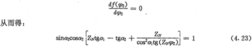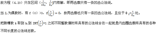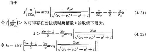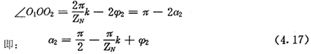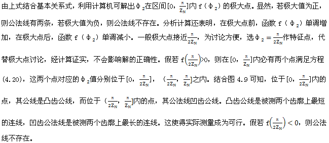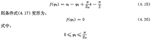 上式就是齒廓AB上與跨槽數(shù)為k的齒廓具有公法線的點的條件。當k確定后,若存在公法線,則由(4.17)式并結(jié)合基本關(guān)系式(2.38)等可解出φ2的值來。