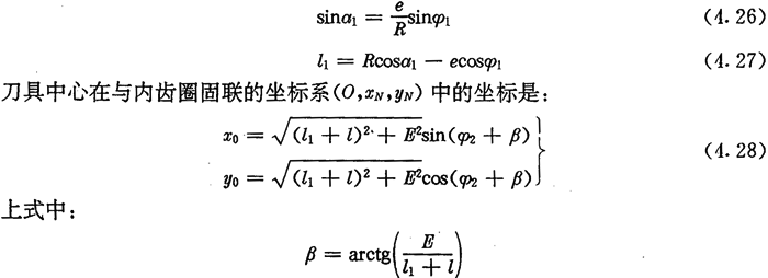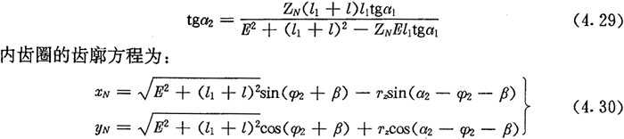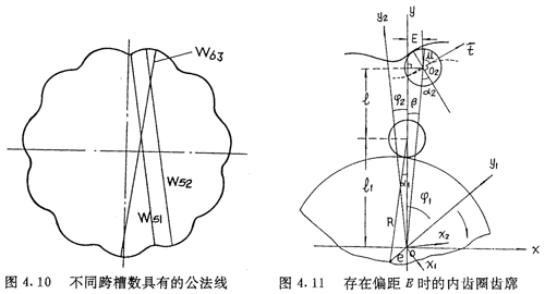 若令(4.30)式和(4.31)式中的E=0,得到的就是無偏距時的內(nèi)齒圈齒廓理論方程式(2.21)及公法線長度(4.18)式。