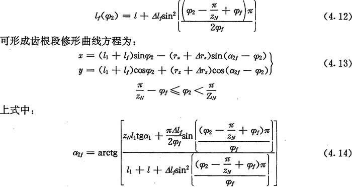 顯然,未經(jīng)修形的齒廓曲線在齒頂鄰域和齒根鄰域嚙合的壓力角都很小,因而分段修形后應將頂、根部大致削去相同的區(qū)段。即φa、φf仰的分配應根據(jù)各自所對應的頂根段曲線弧長相等的原則來進行。一般可近似取φa為φf的2到4倍,而取△la=△lf=esinφa。