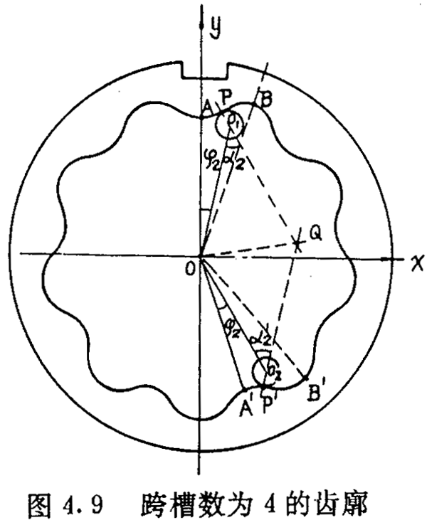 如圖4.9 所示,AB是其中一個齒槽的一側(cè)齒廓,A′B′是跨槽數(shù)為K(圖中k=4)的一個齒梢的另一側(cè)齒廓,它們是兩個性質(zhì)不同的齒廓。若把AB看成是工作齒廓,則A′B′是非工作齒廓。選擇圖4.9所示的坐標系,讓坐標原點O與內(nèi)齒圈幾何中心重合,y軸與OA重合。設P(x,y)為AB齒廓上的一點,在P點與內(nèi)齒圈齒廓相接觸的外滾子的位置角為φ2,在A′B′上取P點的對應點P′,使∠A′OO2=φ2,P′點與P點是關(guān)于∠AOA′的平分線完全對稱的,即0P′=OP,a2=a2′,OO1=OO2,圖4.9中PO1與P′O2相交在Q點,它們并不共線,因此P′點與P點不具有共同的法線。假設隨著P點位置的改變(當然P′點也隨著P的改變而改變),使PO1與P′O2在同一條直線上,此時P′與P就有共同的法線,此時: