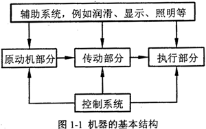 機器的發(fā)展經(jīng)歷了一個由簡單到復(fù)雜的過程,人類為滿足生產(chǎn)及生活的需要,設(shè)計和制造出了種類繁多、功能各異的機器。機器類型多種多樣,基本結(jié)構(gòu)可以歸結(jié)為如圖1-l所示。機器的功能各異,所要求的運動形式千變?nèi)f化,并且需要克服的阻力、阻力矩也因機器工作情況而異。一般說來,原動機的運動形式、運動及動力參數(shù)都是有限的,而且是確定的。這樣必須解決把原動機的運動形式、運動及動力參數(shù)轉(zhuǎn)變?yōu)閳?zhí)行部分所需的運動形式、運動及動力參數(shù)的問題。這就必須靠機器的傳動部分來完成,即機器中的傳動部分是機器為完成各種功能所必需的基本構(gòu)成。