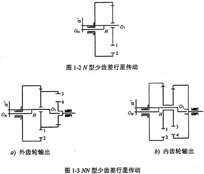 本文所研究的三環(huán)減速機傳動屬于漸開線少齒差傳動,故有必要對漸開線少齒差傳動進行深入的探討。對于標(biāo)準(zhǔn)漸開線內(nèi)嚙合行星齒輪傳動,當(dāng)其中心內(nèi)齒輪2和行星外齒輪l的齒數(shù)差小于8時,即zp=z2-z1<8(z2=78~200),則該內(nèi)嚙合齒輪副就會產(chǎn)生過渡曲線干涉和齒廓重迭干涉。為了避免內(nèi)嚙合齒輪傳動的各種干涉,可以采取變位的內(nèi)嚙合齒輪傳動,但是采取變位齒輪傳動要保證內(nèi)、外齒輪的齒頂不得變尖,要有足夠的厚度。漸開線少齒差行星傳動,就是由齒數(shù)差很小(一般zp=1~4)的漸開線內(nèi)嚙合變位齒輪副組成的K-H-V(N)型傳動或ZK-H(NN)型傳動。中心輪代號K,轉(zhuǎn)臂代號H,輸出構(gòu)件代號V。N型少齒差傳動示意圖如圖1-2所示,圖中1為行星外齒輪,2為中心內(nèi)齒輪,H為輸入軸,又稱為轉(zhuǎn)臂。行星輪1裝在有偏心距a′的輸入軸上,當(dāng)輸入軸旋轉(zhuǎn)時,行星輪不僅繞其安裝在H上的軸線O1轉(zhuǎn)動,且同時隨著H繞著固定的軸線OH回轉(zhuǎn),即行星輪的軸線O1在半徑等于偏心距的a′一個圓周上運動;NN型少齒差行星傳動示意圖如圖1-3所示,內(nèi)齒輪2固定不動,H為輸入軸,又是轉(zhuǎn)臂,行星輪1和3是一個整體,裝在有偏心距a′的輸入軸H上,當(dāng)輸入軸旋轉(zhuǎn)時,行星輪不僅繞其安裝在H上的軸線O1轉(zhuǎn)動,并且同時隨H繞著固定的軸線OH回轉(zhuǎn),然后通過齒輪3帶動齒輪4轉(zhuǎn)動,而齒輪4與輸出軸固定在一起,把運動輸出。