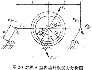 三環(huán)減速機的精確受力分析是指導三環(huán)減速機設計的基礎,采用類比和估算設計制造出的產品存在諸多問題。為此,本章將對三環(huán)減速機的受力分析進行深入的研究,并且探討三環(huán)減速機傳動機理。選取內齒環(huán)板為受力分析對象,它受有重力Gi、慣性力Pi和嚙合力Fni,其中嚙合力Fni是主要的受力形式。考慮到三環(huán)減速機內齒環(huán)板的轉速較高,且其質量較大,故在力學分析中必須將內齒環(huán)板的慣性力和重力考慮在內。首先分析內齒環(huán)板的慣性力,參考如圖2-3所示的對稱A型三環(huán)減速機內齒環(huán)板的受力分析圖,假設內齒環(huán)板的質量為mi,轉臂軸承的質量為miH,內齒環(huán)板的質心在O點,兩轉臂偏心軸的質心分別在Ai和Bi點,轉臂的轉速為nH。r2、rb2分別為內齒輪2的分度圓半徑和基圓半徑,e為轉臂偏心距,即內、外齒輪的實際中心距。內齒輪2的齒數(shù)為Z2,外齒輪的齒數(shù)為Z1,m為齒輪模數(shù)。因內齒環(huán)板做平動,則n2=0,其質心O以轉速nH轉動,軌跡是以e為半徑的圓,則