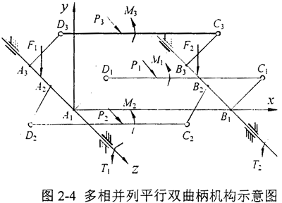 三環(huán)減速機采用三相并列平行雙曲柄機構作為輸入機構,多相并列平行雙曲柄機構如圖2-4所示,設其并列相數(shù)為n,多相平行雙曲柄機構分別為A1B1C1D1、A2B2C2D2、……AnBnCnDn,F(xiàn)1、F2分別為兩根曲柄軸上的力;T1、T2分別為兩根曲柄軸上的力矩:P1、P2、……Pn分別為平行雙曲柄機構連桿上的力,M1、M2、……Mn分別為各連桿即內齒環(huán)板上的力矩。按機構自由度分析方法,其自由度為:F=2-n,機構中所含的虛約束數(shù)為x=n-1。所以,三環(huán)減速機的機構自由度為:F=-1,機構中的虛約束為x=2。三環(huán)減速機運動鏈不滿足靜定條件,用一般平面剛體力學分析方法無法完全求得機構的受力。目前只能采用類比設計或借助于十分粗略的模型進行受力分析,由此造成品性能不穩(wěn)定,減速機使用過程中常出現(xiàn)發(fā)熱、振動噪聲大、軸承早期損壞等現(xiàn)象,嚴重制約了這種傳動形式的進一步發(fā)展。分析其原因,主要有:1.沒有弄清各零部件之間的力學關系,使得設計參數(shù)選擇不合理;2.各零部件受力后的變形,使機構物件受力更為復雜。為此需要考慮各構件的變形,建立變形協(xié)調條件作為補充方程。首先分析三環(huán)減速機傳動機構變形,三環(huán)減速機傳動機構的主要變形有各構件的接觸變形、軸的扭轉彎曲變形、環(huán)板的拉壓變形等等。根據位移變形分析可知,軸的彎曲變形和環(huán)板的拉壓變形是主要的變形形式。本文研究的環(huán)板間相位差為180°的完全平衡、均載減振兩級三環(huán)減速機HITSH145的環(huán)板結構如圖2-5所示。