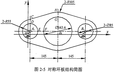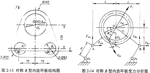 對稱B型三環(huán)減速機的一塊環(huán)板的結構如圖2-13所示,它的受力情況和坐標系選取如圖2-14所示,符號的標定及含義同對稱A型三環(huán)減速機。