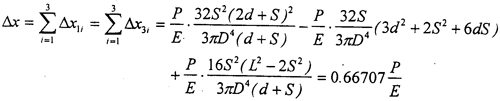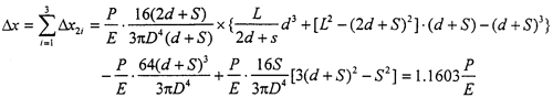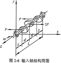 對于三環(huán)減速機輸入軸來說,結構及受載情況如圖2-6所示,其中軸有效長度L=116mm,d=30.5mm,S=27.5mm,輸入軸直徑D=25mm,如果環(huán)板所受載荷為P,則兩側環(huán)板處輸入軸在x方向的撓度△x為三個撓度的疊加: