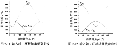 L=145mm,Z1=42,Z2=44,m=3.5mm,α=20°,α′=37.356°,T=875N·m。n=1440r/min,b1=19mm,b2=38mm。則兩輸入軸的偏心軸頸上的環(huán)板軸承載荷FAi、FBi隨輸入曲柄轉角φ變化的曲線如圖2-11、2-12所示。