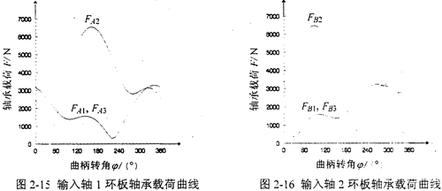 L=105mm,L′=100mm,Z1=42,Z2=44,m=3.5mm,α=20°,α′=37.356°,T=875N·m,n=1440r/min,b1=19mm,b2=38mm。則兩輸入軸的偏心軸頸上的環(huán)板軸承載荷FAi、FBi,隨輸入曲柄轉角φ變化的曲線如圖2-15、2-16所示。