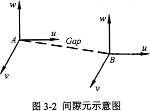 在I-DEAS中,間隙元是為防止兩接觸面產(chǎn)生相互嚙入干涉而定義的,如圖3-2所示,A、B分別為具有初始間隙的分離接觸面上的兩節(jié)點(diǎn),把這兩節(jié)點(diǎn)用間隙元Gap連結(jié)起來(lái)。在I-DEAS中,間隙元主要有三個(gè)屬性,即初始間隙δ0、方位碼u、同軸標(biāo)志Flag,并且,這三個(gè)值是相互關(guān)聯(lián)的。初始間隙并非模型圖中兩節(jié)點(diǎn)之間的距離,而是由用戶給定的一個(gè)精確值,以避免建模誤差。方位碼指定間隙元的方向,具有從-6到+6之間除O之外的的12個(gè)值,分別代表6個(gè)自由度的正負(fù)方向,即沿x、y、z軸的移動(dòng)和轉(zhuǎn)動(dòng)方向。同軸標(biāo)志取0或1,當(dāng)Flag=0時(shí),方位碼有效,間隙元沿某一指定坐標(biāo)方向;Flag=1時(shí),方位碼無(wú)效,間隙元沿兩節(jié)點(diǎn)連線方向。在圖3-2中,設(shè)指定方位碼為沿u向,F(xiàn)lag=0,則當(dāng)uA-uB≤δ0時(shí),認(rèn)為間隙元沒(méi)有閉合,接觸面間不會(huì)產(chǎn)生應(yīng)力應(yīng)變。而一旦uA-uB>δ0,則認(rèn)為間隙元已閉合,間隙元在指定方向?qū)⒕哂泻艽蟮膭偠龋ㄈ笔r(shí)系統(tǒng)一般取接觸面材料的三階),此時(shí)兩節(jié)點(diǎn)無(wú)法沿指定方向相互嵌入,而只能沿指定方向切向運(yùn)動(dòng)。如指定接觸面摩擦系數(shù),閉合后的間隙元還將具有一定的橫向剛度,即沿切向摩擦阻尼產(chǎn)生的等效剛度。