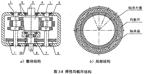 對(duì)于三環(huán)減速機(jī)來(lái)說(shuō),因三片內(nèi)齒環(huán)板受力大,質(zhì)量大,環(huán)板中心移動(dòng)量小,可以利用本文提出金屬?gòu)椥原h(huán)作為均載機(jī)構(gòu),彈性均載環(huán)加裝在輸出軸和一級(jí)輸入軸上的軸承外圈和軸承座孔之間,彈性均載環(huán)結(jié)構(gòu)如圖3-8所示。a)為整體結(jié)構(gòu),b)為局部結(jié)構(gòu)。輸出軸均載環(huán)9加裝在三環(huán)減速機(jī)的輸出軸2的軸承外圈和軸承座孔之間,輸入軸均載環(huán)10加裝在三環(huán)減速機(jī)的一級(jí)輸入軸8的軸承外圈和軸承座孔之間,彈性環(huán)的變形使輸出軸和一級(jí)輸入軸上的外齒輪浮動(dòng),補(bǔ)償制造安裝誤差和傳動(dòng)變形,從而可以實(shí)現(xiàn)三環(huán)減速機(jī)的均載和減振。