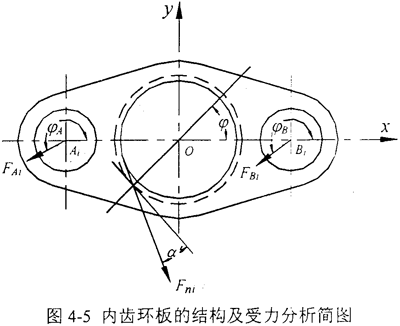 由圖4-7、4-8可知,內(nèi)齒環(huán)板的應(yīng)力與位移都以360°為周期變化,最大位移出現(xiàn)在φ=270°時(shí)的工況位置,這是因?yàn)榇藭r(shí)的嚙合力Fni和Bi孔與配合軸間的作用力FBi都出現(xiàn)在φ=270°附近,它們的彎曲效應(yīng)和剪切效應(yīng)共同作用,出現(xiàn)位移的最大值點(diǎn),同時(shí)也說(shuō)明環(huán)板的最上部、最下部是環(huán)板位移的瓶頸環(huán)節(jié);最大應(yīng)力出現(xiàn)在180°+α′時(shí)的工況位置,這是因?yàn)榇藭r(shí)的嚙合力Fni、Ai孔與配合軸間的作用力FAi和Bi孔與配合軸間的作用力FBi都出現(xiàn)在φ=180°附近,它們的彎曲效應(yīng)和剪切效應(yīng)共同作用,出現(xiàn)應(yīng)力的最大值點(diǎn),同時(shí)也說(shuō)明環(huán)板內(nèi)齒輪與兩個(gè)Ai孔、Bi孔的聯(lián)接部分是內(nèi)齒環(huán)板應(yīng)力的瓶頸環(huán)節(jié)。