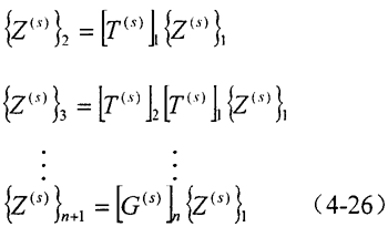 當(dāng)不計阻尼時,慣性元件的傳遞矩陣是系統(tǒng)振動頻率的平方ω2的函數(shù),彈性元件的傳遞矩陣僅與元件的剛度有關(guān),所以系統(tǒng)累積傳遞矩陣的元素G22是ω2的函數(shù),并且ω2的階次與系統(tǒng)的慣性元件數(shù)目相同,所以滿足式(4-25)的振動頻率均為系統(tǒng)的固有頻率。