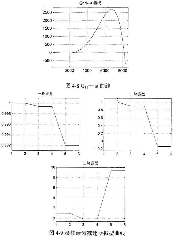 根據(jù)前面介紹的方法,在計算機(jī)上編程對減速器的扭振動力學(xué)特性進(jìn)行分析,其程序框圖見圖4-7所示。在計算機(jī)上運算時,按照確定的頻率步長對頻率方程掃頻,作出“G11-ω”曲線,如圖4-8所示,凡G22=0時的ω值,就是系統(tǒng)的固有頻率。有關(guān)固有頻率、勢能分布率和模態(tài)柔度的計算結(jié)果見表4-2。另外,利用該程序還繪制出圖4-9所示的減速器系統(tǒng)的振型曲線。