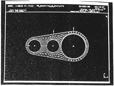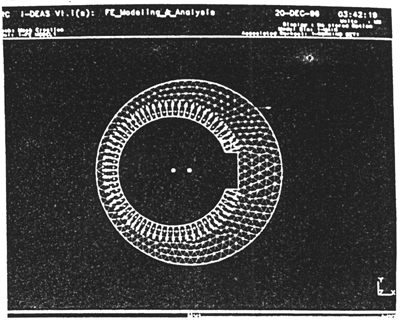 從上節(jié)介紹知,彈性體的柔度系數(shù)矩陣可以通過有限元法,加單位載荷來計算確定。因此,偏心套及內(nèi)齒行星傳動齒板的柔度計算,實際上是對其進(jìn)行有限元建模分析。下面以SHQ40型三環(huán)傳動為例,在SUN工作站上使用I-DEAS軟件中的有限元模塊計算偏心套及齒板的柔度系數(shù)。
